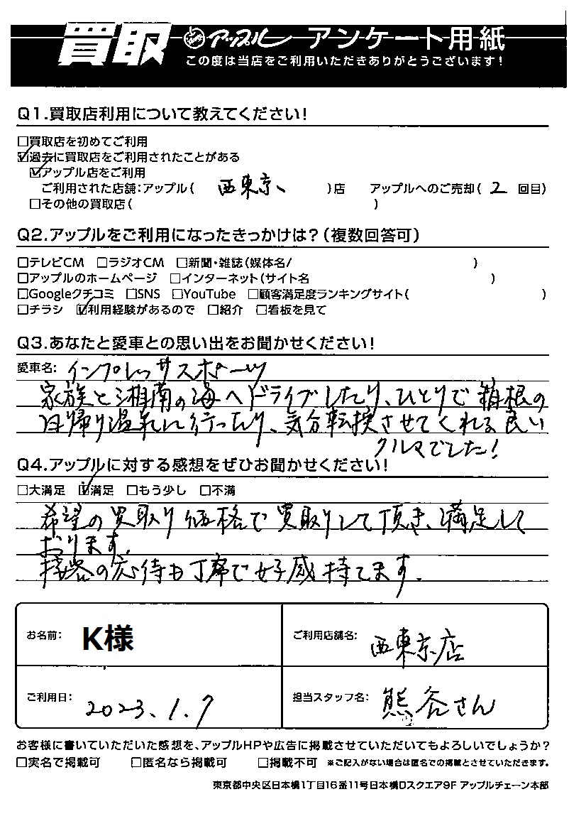 K様 車名:スバル インプレッサスポーツ