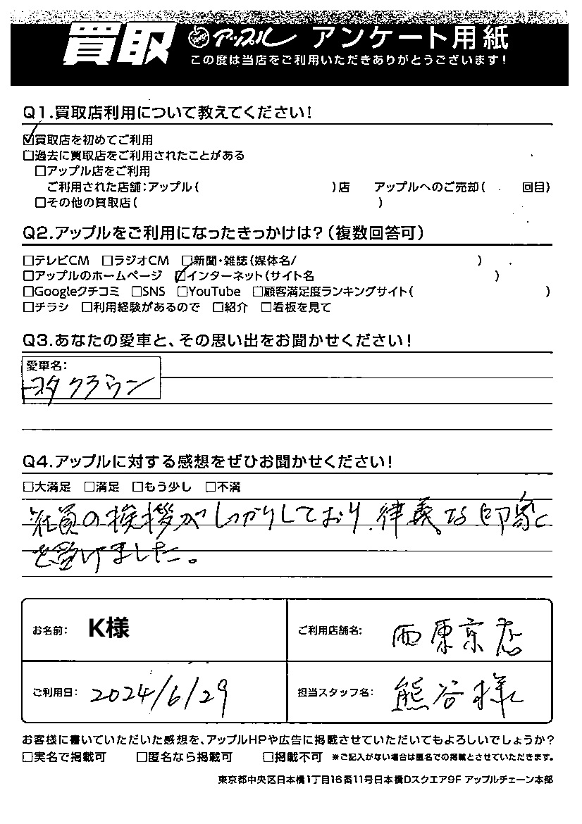 お車のご相談・ 査定だけでもOK! カンタン 入力 30秒 アップルがブランド買取始めました! お電話でも受付中! 受付時間10:00 ~ 19:00 0120-28-1688 お車のご相談・ 査定だけでもOK! カンタン 入力 30秒 アップルがブランド買取始めました! お電話でも受付中! 受付時間10:00 ~ 19:00 0120-28-1688 アップルがブランド買取始めました! お電話でも受付中! 受付時間10:00 ~ 19:00 0120-28-1688 店舗情報 在庫車 スタッフ紹介 ブログ お客様の声 キャンペーン 無料査定 click お客様の声 ご記入日: 2024/06/29 k様 車名:トヨタ クラウンセダン ご利用日:2024年6月29日愛車:トヨタ クラウン担当:熊谷Q:アップルに対する感想をぜひお聞かせください!!A:社員の挨拶がしっかりしており、律義な印象を 受けました。 前へ 次へ お客様の声一覧を見る