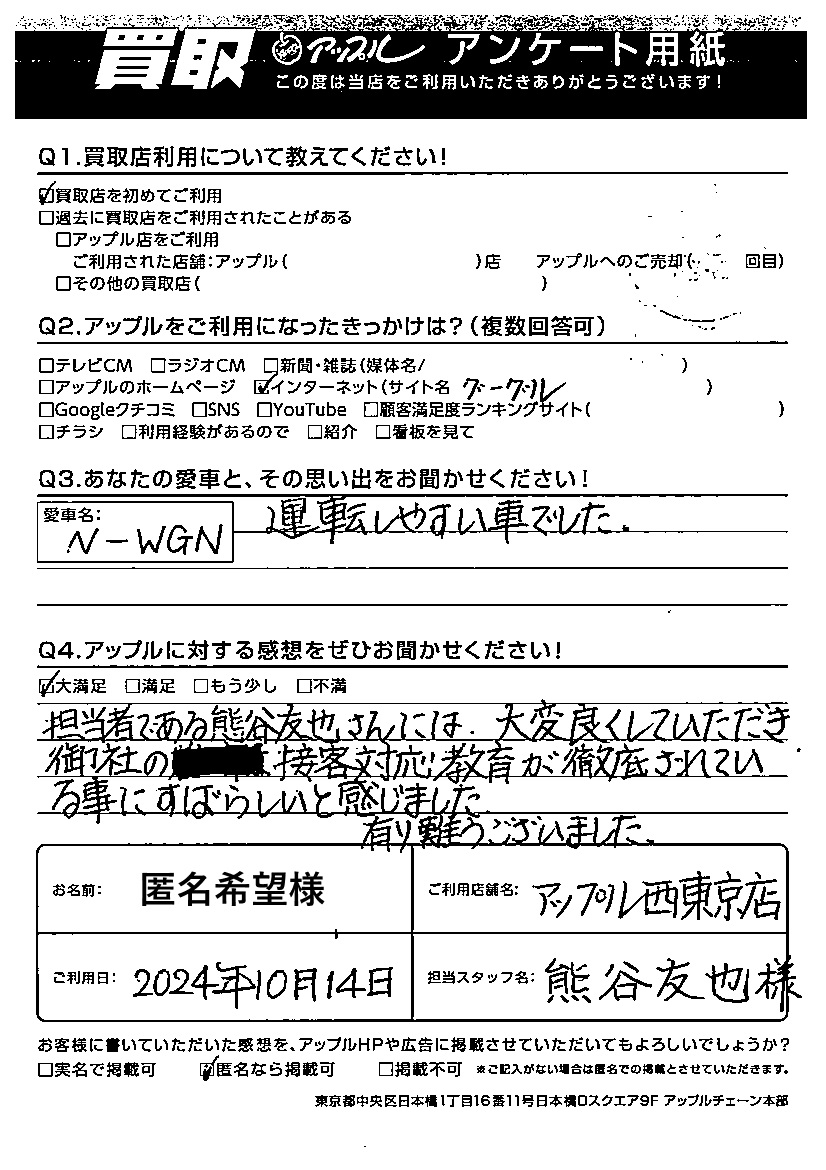 担当者である熊谷友也さんには、大変良くしていただき、御社の接客対応教育が
