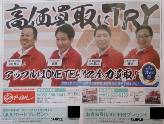 お車のご相談・ 査定だけでもOK! カンタン 入力 30秒 アップルがブランド買取始めました! お電話でも受付中! 受付時間 10:00 ~ 19:00 052-528-5335 お車のご相談・ 査定だけでもOK! カンタン 入力 30秒 アップルがブランド買取始めました! お電話でも受付中! 受付時間 10:00 ~ 19:00 052-528-5335 アップルがブランド買取始めました! お電話でも受付中! 受付時間 10:00 ~ 19:00 052-528-5335 店舗情報 在庫車 スタッフ紹介 ブログ お客様の声 キャンペーン お得 無料査定 click [ つぶやき ] 2019/11/30 (土) 10:34 フリモ発刊!! みなさま、こんにちは!!アドバイザーの藤本です!!本日のブログはフリモ発刊のお知らせです!!11/28より名古屋フリモ(西区版)が発刊されました!!上記冊子のこのページを探していただきご来店時にご持参ください!査定のお客様にはQUOカードをご成約のお客様にはお食事券5000円分をプレゼント致します!!なお、有効期限がございますのでお気を付け下さい。皆様のご来店心よりお待ちしております。以上、藤本でした!! 2019-11-30 10:34:30 新しい記事へ 古い記事へ 最新記事 臨時休業のご案内おかげさまで23周年★当店限定キャンペーン第二弾!ご納車パート2☆ご納車♪ 店舗情報に戻る 月別アーカイブ 2026年04月(4)2026年03月(4)2026年02月(6)2026年01月(7)2025年12月(10)2025年11月(11)2025年10月(5)2025年09月(10)2025年08月(10)2025年07月(9)2025年06月(9)2025年05月(9)2025年04月(8)2025年03月(7)2025年02月(9)2025年01月(6)2024年12月(8)2024年11月(5)2024年10月(8)2024年09月(6)2024年08月(8)2024年07月(15)2024年06月(11)2024年05月(9)2024年04月(9)2024年03月(5)2024年02月(4)2024年01月(6)2023年12月(5)2023年11月(6)2023年10月(8)2023年09月(6)2023年08月(9)2023年07月(5)2023年06月(8)2023年05月(7)2023年04月(7)2023年03月(6)2023年02月(4)2023年01月(11)2022年12月(13)2022年11月(9)2022年10月(9)2022年09月(12)2022年08月(9)2022年07月(15)2022年06月(12)2022年05月(9)2022年04月(17)2022年03月(12)2022年02月(9)2022年01月(12)2021年12月(14)2021年11月(16)2021年10月(21)2021年09月(20)2021年08月(18)2021年07月(22)2021年06月(19)2021年05月(11)2021年04月(9)2021年03月(4)2021年02月(2)2021年01月(4)2020年12月(2)2020年11月(5)2020年10月(7)2020年09月(8)2020年08月(12)2020年07月(8)2020年06月(13)2020年05月(14)2020年04月(12)2020年03月(11)2020年02月(6)2020年01月(7)2019年12月(6)2019年11月(3)2019年10月(3)2019年09月(4)2019年08月(7)2019年07月(9)2019年06月(11)2019年05月(13)2019年04月(10)2019年03月(5)2019年02月(6)2019年01月(1)2018年12月(8)2018年11月(4)2018年10月(4)2018年09月(12)2018年08月(15)2018年07月(13)2018年06月(7)2018年05月(7)2018年04月(7)2018年03月(3)2017年12月(1)2017年11月(3)2017年10月(6)2017年09月(5)2017年08月(5)2017年07月(3)2017年06月(2)2017年05月(2)2017年04月(4)2017年03月(3)2017年02月(4)2017年01月(6)2016年12月(6)2016年11月(5)2016年10月(6)2016年09月(6)2016年08月(11)2016年07月(5)2016年06月(5)2016年05月(5)2016年04月(6)2016年03月(5)2016年02月(4)2016年01月(6)2015年12月(5)2015年11月(4)2015年10月(5)2015年09月(4)2015年08月(6)2015年07月(5)2015年06月(5)2015年05月(4)2015年04月(4)2015年03月(4)2015年02月(5)2015年01月(4)2014年12月(7)2014年11月(7)2014年10月(7)2014年09月(5)2014年08月(8)2014年07月(8)2014年06月(11)2014年05月(8)2014年04月(5)2014年02月(1)2014年01月(1)2013年12月(2)2013年11月(2)2013年10月(1)2013年09月(1)
