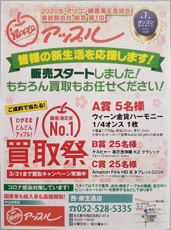 お車のご相談・ 査定だけでもOK! カンタン 入力 30秒 アップルがブランド買取始めました! お電話でも受付中! 受付時間 10:00 ~ 19:00 052-528-5335 お車のご相談・ 査定だけでもOK! カンタン 入力 30秒 アップルがブランド買取始めました! お電話でも受付中! 受付時間 10:00 ~ 19:00 052-528-5335 アップルがブランド買取始めました! お電話でも受付中! 受付時間 10:00 ~ 19:00 052-528-5335 店舗情報 在庫車 スタッフ紹介 ブログ お客様の声 キャンペーン お得 無料査定 click [ 未分類 ] 2021/03/01 (月) 13:39 三月のお得情報!! ブログをご覧の皆様 こんにちは アドバイザーの安田です。 本日から3月が始まりますね また、愛知県は緊急事態宣言も解除されました!! 当店では、コロナ対策を引き続き継続していますので ご安心してご来店ください!! さて今回は、お得情報のご紹介です!! 名古屋フリモ西区版をチェックです。 ご査定させて頂いた方やご成約頂いた方に お得なクーポンが付いておりますので 是非ご覧ください!! ポストをチェックです。 更にただいま ご成約頂いた方に抽選で豪華景品が当たる キャンペーン中 どちらも 期間は3月末までとなりますので ご売却をお考えの方は 是非ご来店ください!! 2021-03-01 13:39:30 新しい記事へ 古い記事へ 最新記事 臨時休業のご案内おかげさまで23周年★当店限定キャンペーン第二弾!ご納車パート2☆ご納車♪ 店舗情報に戻る 月別アーカイブ 2026年04月(4)2026年03月(4)2026年02月(6)2026年01月(7)2025年12月(10)2025年11月(11)2025年10月(5)2025年09月(10)2025年08月(10)2025年07月(9)2025年06月(9)2025年05月(9)2025年04月(8)2025年03月(7)2025年02月(9)2025年01月(6)2024年12月(8)2024年11月(5)2024年10月(8)2024年09月(6)2024年08月(8)2024年07月(15)2024年06月(11)2024年05月(9)2024年04月(9)2024年03月(5)2024年02月(4)2024年01月(6)2023年12月(5)2023年11月(6)2023年10月(8)2023年09月(6)2023年08月(9)2023年07月(5)2023年06月(8)2023年05月(7)2023年04月(7)2023年03月(6)2023年02月(4)2023年01月(11)2022年12月(13)2022年11月(9)2022年10月(9)2022年09月(12)2022年08月(9)2022年07月(15)2022年06月(12)2022年05月(9)2022年04月(17)2022年03月(12)2022年02月(9)2022年01月(12)2021年12月(14)2021年11月(16)2021年10月(21)2021年09月(20)2021年08月(18)2021年07月(22)2021年06月(19)2021年05月(11)2021年04月(9)2021年03月(4)2021年02月(2)2021年01月(4)2020年12月(2)2020年11月(5)2020年10月(7)2020年09月(8)2020年08月(12)2020年07月(8)2020年06月(13)2020年05月(14)2020年04月(12)2020年03月(11)2020年02月(6)2020年01月(7)2019年12月(6)2019年11月(3)2019年10月(3)2019年09月(4)2019年08月(7)2019年07月(9)2019年06月(11)2019年05月(13)2019年04月(10)2019年03月(5)2019年02月(6)2019年01月(1)2018年12月(8)2018年11月(4)2018年10月(4)2018年09月(12)2018年08月(15)2018年07月(13)2018年06月(7)2018年05月(7)2018年04月(7)2018年03月(3)2017年12月(1)2017年11月(3)2017年10月(6)2017年09月(5)2017年08月(5)2017年07月(3)2017年06月(2)2017年05月(2)2017年04月(4)2017年03月(3)2017年02月(4)2017年01月(6)2016年12月(6)2016年11月(5)2016年10月(6)2016年09月(6)2016年08月(11)2016年07月(5)2016年06月(5)2016年05月(5)2016年04月(6)2016年03月(5)2016年02月(4)2016年01月(6)2015年12月(5)2015年11月(4)2015年10月(5)2015年09月(4)2015年08月(6)2015年07月(5)2015年06月(5)2015年05月(4)2015年04月(4)2015年03月(4)2015年02月(5)2015年01月(4)2014年12月(7)2014年11月(7)2014年10月(7)2014年09月(5)2014年08月(8)2014年07月(8)2014年06月(11)2014年05月(8)2014年04月(5)2014年02月(1)2014年01月(1)2013年12月(2)2013年11月(2)2013年10月(1)2013年09月(1)
