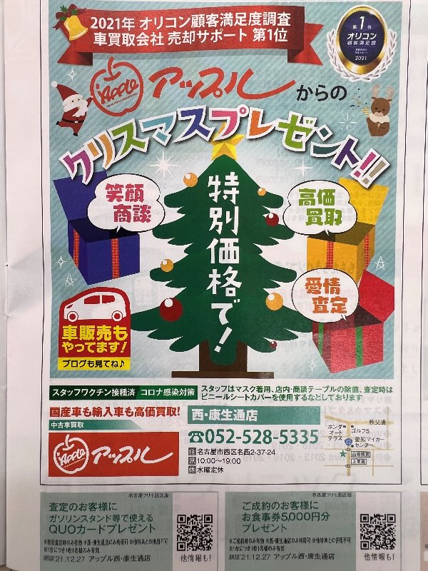 お車のご相談・ 査定だけでもOK! カンタン 入力 30秒 アップルがブランド買取始めました! お電話でも受付中! 受付時間 10:00 ~ 19:00 052-528-5335 お車のご相談・ 査定だけでもOK! カンタン 入力 30秒 アップルがブランド買取始めました! お電話でも受付中! 受付時間 10:00 ~ 19:00 052-528-5335 アップルがブランド買取始めました! お電話でも受付中! 受付時間 10:00 ~ 19:00 052-528-5335 店舗情報 在庫車 スタッフ紹介 ブログ お客様の声 キャンペーン お得 無料査定 click [ 未分類 ] 2021/11/27 (土) 11:12 ☆大変お得な情報です☆ 皆様こんにちは☆ アップル西・康生通店の岩田です♪ 最近朝がとても寒くて 布団から中々出られない日々が続いています(;´・ω・) 寒いと動きが鈍りますが 暑がりなワタクシは暑い方が鈍くなるので 着こめば暖かい冬の方がまだマシと思います(`・ω・´) さて、今回はアップル西・康生通店から 大変お得な情報がございます! 11月25日発刊の「名古屋フリモ西区版12月号」に アップル西・康生通店が掲載されております(=゚ω゚)ノ こちら西区に在住の方に無料で配達されております! そしてアップル西・康生通店が 掲載されている場所を探してみてください! 忙しい方には教えます …14ページの左下に掲載されております… そして下の方をご覧ください! こちらには当店でのみ使える 大変お得なクーポンがございます(´っ・ω・)っ フリモご持参の上で 無料の査定をさせて頂いたお客様に QUOカードをプレゼント致します! 更にご成約して頂いたお客様には お食事券5,000円分をプレゼント! どちらの期限も2021/12/27になります。 査定は無料! お待ちの間はHOT/ICEのドリンクや 雑誌、新聞などもご用意しております! お気軽にお越しください(=゚ω゚)ノ 最後まで読んでいただきありがとうございます! 2021-11-27 11:12:15 新しい記事へ 古い記事へ 最新記事 臨時休業のご案内おかげさまで23周年★当店限定キャンペーン第二弾!ご納車パート2☆ご納車♪ 店舗情報に戻る 月別アーカイブ 2026年04月(4)2026年03月(4)2026年02月(6)2026年01月(7)2025年12月(10)2025年11月(11)2025年10月(5)2025年09月(10)2025年08月(10)2025年07月(9)2025年06月(9)2025年05月(9)2025年04月(8)2025年03月(7)2025年02月(9)2025年01月(6)2024年12月(8)2024年11月(5)2024年10月(8)2024年09月(6)2024年08月(8)2024年07月(15)2024年06月(11)2024年05月(9)2024年04月(9)2024年03月(5)2024年02月(4)2024年01月(6)2023年12月(5)2023年11月(6)2023年10月(8)2023年09月(6)2023年08月(9)2023年07月(5)2023年06月(8)2023年05月(7)2023年04月(7)2023年03月(6)2023年02月(4)2023年01月(11)2022年12月(13)2022年11月(9)2022年10月(9)2022年09月(12)2022年08月(9)2022年07月(15)2022年06月(12)2022年05月(9)2022年04月(17)2022年03月(12)2022年02月(9)2022年01月(12)2021年12月(14)2021年11月(16)2021年10月(21)2021年09月(20)2021年08月(18)2021年07月(22)2021年06月(19)2021年05月(11)2021年04月(9)2021年03月(4)2021年02月(2)2021年01月(4)2020年12月(2)2020年11月(5)2020年10月(7)2020年09月(8)2020年08月(12)2020年07月(8)2020年06月(13)2020年05月(14)2020年04月(12)2020年03月(11)2020年02月(6)2020年01月(7)2019年12月(6)2019年11月(3)2019年10月(3)2019年09月(4)2019年08月(7)2019年07月(9)2019年06月(11)2019年05月(13)2019年04月(10)2019年03月(5)2019年02月(6)2019年01月(1)2018年12月(8)2018年11月(4)2018年10月(4)2018年09月(12)2018年08月(15)2018年07月(13)2018年06月(7)2018年05月(7)2018年04月(7)2018年03月(3)2017年12月(1)2017年11月(3)2017年10月(6)2017年09月(5)2017年08月(5)2017年07月(3)2017年06月(2)2017年05月(2)2017年04月(4)2017年03月(3)2017年02月(4)2017年01月(6)2016年12月(6)2016年11月(5)2016年10月(6)2016年09月(6)2016年08月(11)2016年07月(5)2016年06月(5)2016年05月(5)2016年04月(6)2016年03月(5)2016年02月(4)2016年01月(6)2015年12月(5)2015年11月(4)2015年10月(5)2015年09月(4)2015年08月(6)2015年07月(5)2015年06月(5)2015年05月(4)2015年04月(4)2015年03月(4)2015年02月(5)2015年01月(4)2014年12月(7)2014年11月(7)2014年10月(7)2014年09月(5)2014年08月(8)2014年07月(8)2014年06月(11)2014年05月(8)2014年04月(5)2014年02月(1)2014年01月(1)2013年12月(2)2013年11月(2)2013年10月(1)2013年09月(1)