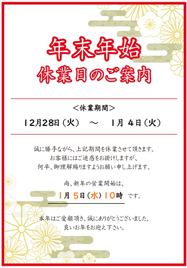 12月28日㈫~1/4㈫まで冬季休業☆