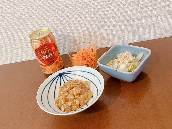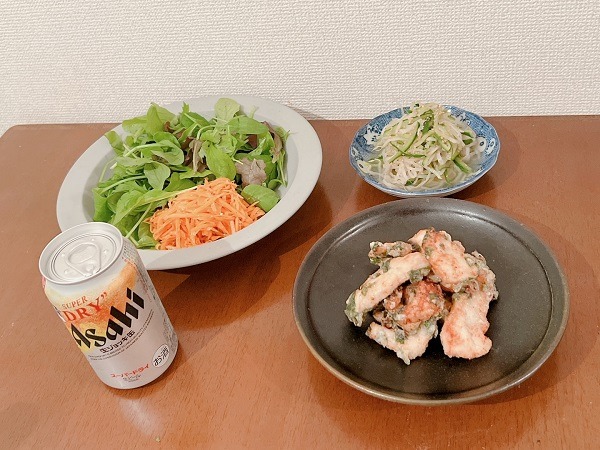 こちらは、鶏むね肉の大場揚げ、ベビーリーフと人参マリネのサラダ、もやしときゅうりのナムルです♪
