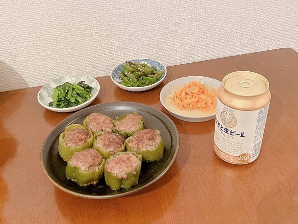 こちらは、ピーマンの肉詰め、小松菜ナムル、ピーマンの和え物、人参マリネ☆