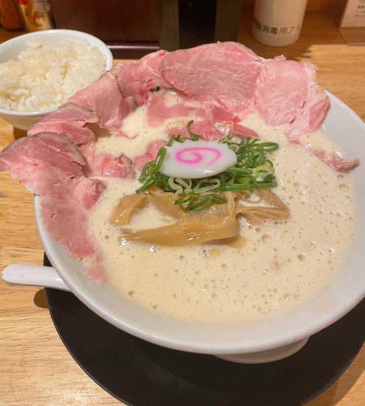 レアチャーシューと泡立った鳥白湯スープが特徴のラーメンです。