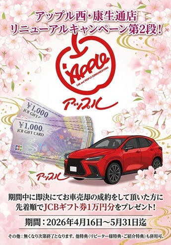 お車のご相談・ 査定だけでもOK! カンタン 入力 30秒 アップルがブランド買取始めました! お電話でも受付中! 受付時間 10:00 ~ 19:00 052-528-5335 お車のご相談・ 査定だけでもOK! カンタン 入力 30秒 アップルがブランド買取始めました! お電話でも受付中! 受付時間 10:00 ~ 19:00 052-528-5335 アップルがブランド買取始めました! お電話でも受付中! 受付時間 10:00 ~ 19:00 052-528-5335 店舗情報 在庫車 スタッフ紹介 ブログ お客様の声 キャンペーン お得 無料査定 click [ 未分類 ] 2026/04/19 (日) 10:00 おかげさまで23周年★ アップル西・康生通店のブログをご覧の皆様(^^)/おはようございます♪店長のおおたにです(*^^*)本日は!当店のオープン記念日となります♡平成15年の4/19ににオープンさせて頂き、本日でなんと23周年となります。23年間もこの地で営業させて頂けている事。。。本当に有難いですm(__)mご利用頂いているお客様 本当に有難うございます!色々な方に支えられている事を忘れず感謝の気持ちでこれからもスタッフ一同 頑張ります(^^)/引き続き宜しくお願い致します♪オトクなキャンペーンも開催中ですよ!本日もご来店お待ち致しております。 2026-04-19 10:00:00 新しい記事へ 古い記事へ 最新記事 おかげさまで23周年★当店限定キャンペーン第二弾!ご納車パート2☆ご納車♪SAKURA 店舗情報に戻る 月別アーカイブ 2026年04月(3)2026年03月(4)2026年02月(6)2026年01月(7)2025年12月(10)2025年11月(11)2025年10月(5)2025年09月(10)2025年08月(10)2025年07月(9)2025年06月(9)2025年05月(9)2025年04月(8)2025年03月(7)2025年02月(9)2025年01月(6)2024年12月(8)2024年11月(5)2024年10月(8)2024年09月(6)2024年08月(8)2024年07月(15)2024年06月(11)2024年05月(9)2024年04月(9)2024年03月(5)2024年02月(4)2024年01月(6)2023年12月(5)2023年11月(6)2023年10月(8)2023年09月(6)2023年08月(9)2023年07月(5)2023年06月(8)2023年05月(7)2023年04月(7)2023年03月(6)2023年02月(4)2023年01月(11)2022年12月(13)2022年11月(9)2022年10月(9)2022年09月(12)2022年08月(9)2022年07月(15)2022年06月(12)2022年05月(9)2022年04月(17)2022年03月(12)2022年02月(9)2022年01月(12)2021年12月(14)2021年11月(16)2021年10月(21)2021年09月(20)2021年08月(18)2021年07月(22)2021年06月(19)2021年05月(11)2021年04月(9)2021年03月(4)2021年02月(2)2021年01月(4)2020年12月(2)2020年11月(5)2020年10月(7)2020年09月(8)2020年08月(12)2020年07月(8)2020年06月(13)2020年05月(14)2020年04月(12)2020年03月(11)2020年02月(6)2020年01月(7)2019年12月(6)2019年11月(3)2019年10月(3)2019年09月(4)2019年08月(7)2019年07月(9)2019年06月(11)2019年05月(13)2019年04月(10)2019年03月(5)2019年02月(6)2019年01月(1)2018年12月(8)2018年11月(4)2018年10月(4)2018年09月(12)2018年08月(15)2018年07月(13)2018年06月(7)2018年05月(7)2018年04月(7)2018年03月(3)2017年12月(1)2017年11月(3)2017年10月(6)2017年09月(5)2017年08月(5)2017年07月(3)2017年06月(2)2017年05月(2)2017年04月(4)2017年03月(3)2017年02月(4)2017年01月(6)2016年12月(6)2016年11月(5)2016年10月(6)2016年09月(6)2016年08月(11)2016年07月(5)2016年06月(5)2016年05月(5)2016年04月(6)2016年03月(5)2016年02月(4)2016年01月(6)2015年12月(5)2015年11月(4)2015年10月(5)2015年09月(4)2015年08月(6)2015年07月(5)2015年06月(5)2015年05月(4)2015年04月(4)2015年03月(4)2015年02月(5)2015年01月(4)2014年12月(7)2014年11月(7)2014年10月(7)2014年09月(5)2014年08月(8)2014年07月(8)2014年06月(11)2014年05月(8)2014年04月(5)2014年02月(1)2014年01月(1)2013年12月(2)2013年11月(2)2013年10月(1)2013年09月(1)