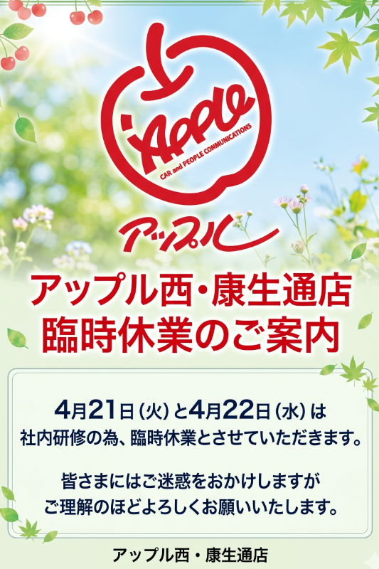 お車のご相談・ 査定だけでもOK! カンタン 入力 30秒 アップルがブランド買取始めました! お電話でも受付中! 受付時間 10:00 ~ 19:00 052-528-5335 お車のご相談・ 査定だけでもOK! カンタン 入力 30秒 アップルがブランド買取始めました! お電話でも受付中! 受付時間 10:00 ~ 19:00 052-528-5335 アップルがブランド買取始めました! お電話でも受付中! 受付時間 10:00 ~ 19:00 052-528-5335 店舗情報 在庫車 スタッフ紹介 ブログ お客様の声 キャンペーン お得 無料査定 click [ 未分類 ] 2026/04/20 (月) 10:50 臨時休業のご案内 皆さまこんにちは!アップル西・康生通店です。画像の通りとなりますが、明日4/22(火)と4/23(水)は社員研修に伴い「臨時休業」とさせて頂きます。4月23日の水曜日は通常の休業日ではございますが、連続して2日間お休みを頂きますので、皆さまにはご迷惑をおかけしますがご理解の程宜しくお願い致します。 2026-04-20 10:50:00 新しい記事へ 古い記事へ 最新記事 臨時休業のご案内おかげさまで23周年★当店限定キャンペーン第二弾!ご納車パート2☆ご納車♪ 店舗情報に戻る 月別アーカイブ 2026年04月(4)2026年03月(4)2026年02月(6)2026年01月(7)2025年12月(10)2025年11月(11)2025年10月(5)2025年09月(10)2025年08月(10)2025年07月(9)2025年06月(9)2025年05月(9)2025年04月(8)2025年03月(7)2025年02月(9)2025年01月(6)2024年12月(8)2024年11月(5)2024年10月(8)2024年09月(6)2024年08月(8)2024年07月(15)2024年06月(11)2024年05月(9)2024年04月(9)2024年03月(5)2024年02月(4)2024年01月(6)2023年12月(5)2023年11月(6)2023年10月(8)2023年09月(6)2023年08月(9)2023年07月(5)2023年06月(8)2023年05月(7)2023年04月(7)2023年03月(6)2023年02月(4)2023年01月(11)2022年12月(13)2022年11月(9)2022年10月(9)2022年09月(12)2022年08月(9)2022年07月(15)2022年06月(12)2022年05月(9)2022年04月(17)2022年03月(12)2022年02月(9)2022年01月(12)2021年12月(14)2021年11月(16)2021年10月(21)2021年09月(20)2021年08月(18)2021年07月(22)2021年06月(19)2021年05月(11)2021年04月(9)2021年03月(4)2021年02月(2)2021年01月(4)2020年12月(2)2020年11月(5)2020年10月(7)2020年09月(8)2020年08月(12)2020年07月(8)2020年06月(13)2020年05月(14)2020年04月(12)2020年03月(11)2020年02月(6)2020年01月(7)2019年12月(6)2019年11月(3)2019年10月(3)2019年09月(4)2019年08月(7)2019年07月(9)2019年06月(11)2019年05月(13)2019年04月(10)2019年03月(5)2019年02月(6)2019年01月(1)2018年12月(8)2018年11月(4)2018年10月(4)2018年09月(12)2018年08月(15)2018年07月(13)2018年06月(7)2018年05月(7)2018年04月(7)2018年03月(3)2017年12月(1)2017年11月(3)2017年10月(6)2017年09月(5)2017年08月(5)2017年07月(3)2017年06月(2)2017年05月(2)2017年04月(4)2017年03月(3)2017年02月(4)2017年01月(6)2016年12月(6)2016年11月(5)2016年10月(6)2016年09月(6)2016年08月(11)2016年07月(5)2016年06月(5)2016年05月(5)2016年04月(6)2016年03月(5)2016年02月(4)2016年01月(6)2015年12月(5)2015年11月(4)2015年10月(5)2015年09月(4)2015年08月(6)2015年07月(5)2015年06月(5)2015年05月(4)2015年04月(4)2015年03月(4)2015年02月(5)2015年01月(4)2014年12月(7)2014年11月(7)2014年10月(7)2014年09月(5)2014年08月(8)2014年07月(8)2014年06月(11)2014年05月(8)2014年04月(5)2014年02月(1)2014年01月(1)2013年12月(2)2013年11月(2)2013年10月(1)2013年09月(1)