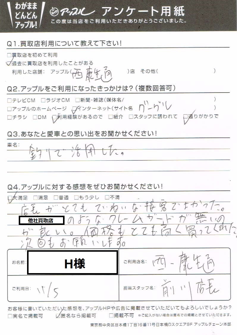 お車のご相談・ 査定だけでもOK! カンタン 入力 30秒 アップルがブランド買取始めました! お電話でも受付中! 受付時間 10:00 ~ 19:00 052-528-5335 お車のご相談・ 査定だけでもOK! カンタン 入力 30秒 アップルがブランド買取始めました! お電話でも受付中! 受付時間 10:00 ~ 19:00 052-528-5335 アップルがブランド買取始めました! お電話でも受付中! 受付時間 10:00 ~ 19:00 052-528-5335 店舗情報 在庫車 スタッフ紹介 ブログ お客様の声 キャンペーン お得 無料査定 click お客様の声 ご記入日: 2021/11/05 H様 ☆大満足☆店長がとてもていねいな接客でよかった。他社買取店のようなクレームガードが無いのが良い。価格もとても高く買ってくれた。次回もお願いします。 前へ 次へ お客様の声一覧を見る