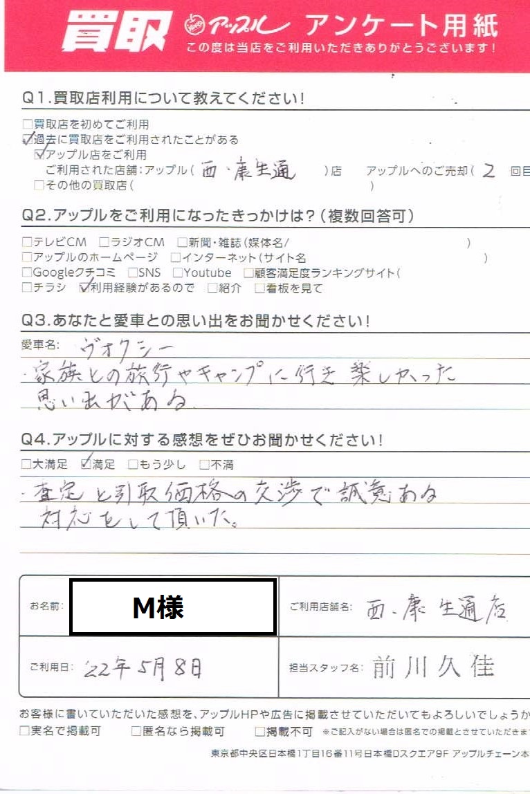 お車のご相談・ 査定だけでもOK! カンタン 入力 30秒 アップルがブランド買取始めました! お電話でも受付中! 受付時間 10:00 ~ 19:00 052-528-5335 お車のご相談・ 査定だけでもOK! カンタン 入力 30秒 アップルがブランド買取始めました! お電話でも受付中! 受付時間 10:00 ~ 19:00 052-528-5335 アップルがブランド買取始めました! お電話でも受付中! 受付時間 10:00 ~ 19:00 052-528-5335 店舗情報 在庫車 スタッフ紹介 ブログ お客様の声 キャンペーン お得 無料査定 click お客様の声 ご記入日: 2022/05/08 M様 車名:トヨタ ヴォクシー ☆満足☆査定と引取価格の交渉で誠意ある対応をして頂いた。 前へ 次へ お客様の声一覧を見る