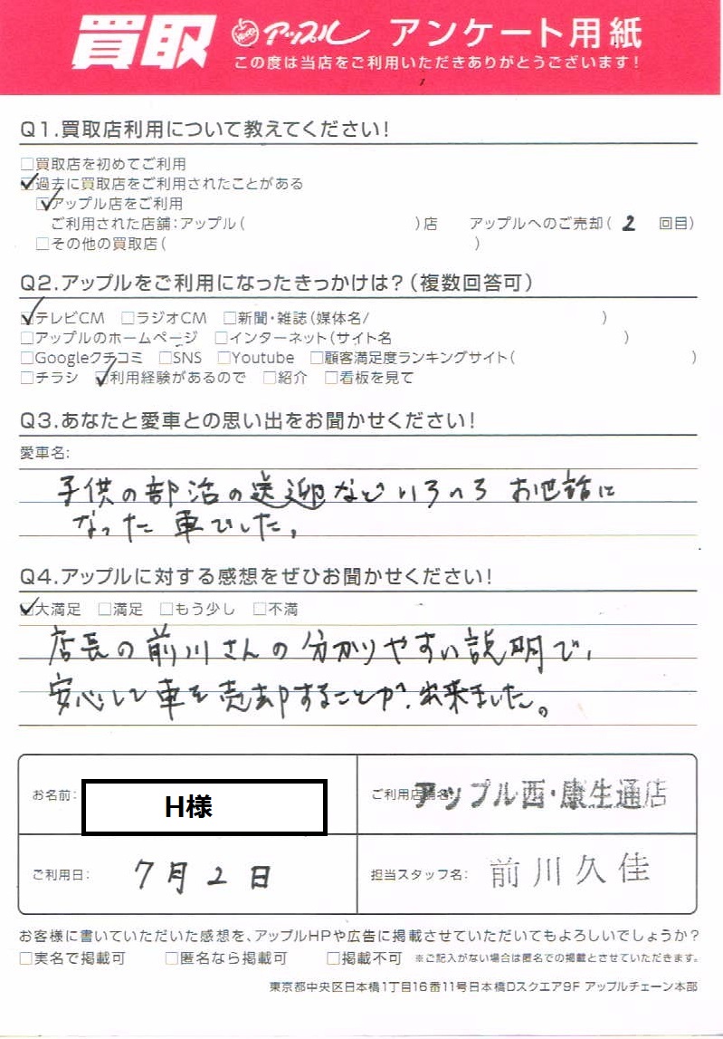 お車のご相談・ 査定だけでもOK! カンタン 入力 30秒 アップルがブランド買取始めました! お電話でも受付中! 受付時間 10:00 ~ 19:00 052-528-5335 お車のご相談・ 査定だけでもOK! カンタン 入力 30秒 アップルがブランド買取始めました! お電話でも受付中! 受付時間 10:00 ~ 19:00 052-528-5335 アップルがブランド買取始めました! お電話でも受付中! 受付時間 10:00 ~ 19:00 052-528-5335 店舗情報 在庫車 スタッフ紹介 ブログ お客様の声 キャンペーン お得 無料査定 click お客様の声 ご記入日: 2022/07/02 H様 ☆大満足☆店長の前川さんの分かりやすい説明で、安心して車を売却することが出来ました。 前へ 次へ お客様の声一覧を見る