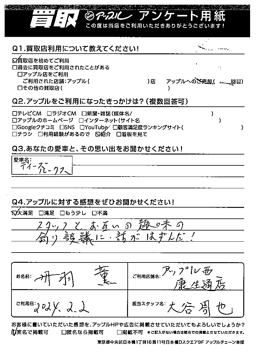 お車のご相談・ 査定だけでもOK! カンタン 入力 30秒 アップルがブランド買取始めました! お電話でも受付中! 受付時間 10:00 ~ 19:00 052-528-5335 お車のご相談・ 査定だけでもOK! カンタン 入力 30秒 アップルがブランド買取始めました! お電話でも受付中! 受付時間 10:00 ~ 19:00 052-528-5335 アップルがブランド買取始めました! お電話でも受付中! 受付時間 10:00 ~ 19:00 052-528-5335 店舗情報 在庫車 スタッフ紹介 ブログ お客様の声 キャンペーン お得 無料査定 click お客様の声 ご記入日: 2024/03/18 丹羽 薫様 車名:日産 デイズルークス ご利用日:2024年2月2日 担当:大谷周也アップルに対する感想をぜひお聞かせください!スタッフとお互いの趣味の釣り談義に話がはずんだ! 前へ 次へ お客様の声一覧を見る