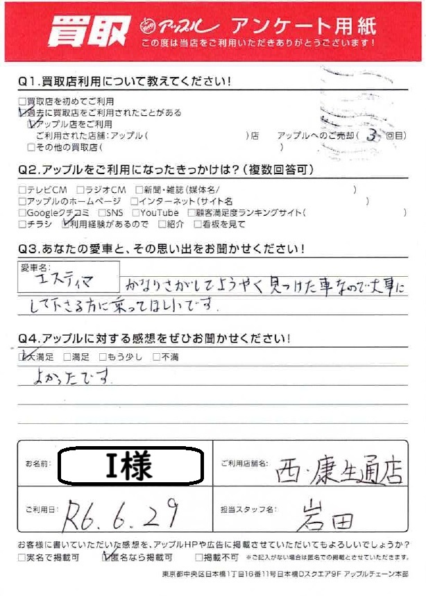 お車のご相談・ 査定だけでもOK! カンタン 入力 30秒 アップルがブランド買取始めました! お電話でも受付中! 受付時間 10:00 ~ 19:00 052-528-5335 お車のご相談・ 査定だけでもOK! カンタン 入力 30秒 アップルがブランド買取始めました! お電話でも受付中! 受付時間 10:00 ~ 19:00 052-528-5335 アップルがブランド買取始めました! お電話でも受付中! 受付時間 10:00 ~ 19:00 052-528-5335 店舗情報 在庫車 スタッフ紹介 ブログ お客様の声 キャンペーン お得 無料査定 click お客様の声 ご記入日: 2024/06/29 I様 車名:トヨタ エスティマ ☆大満足☆よかったです。 前へ 次へ お客様の声一覧を見る