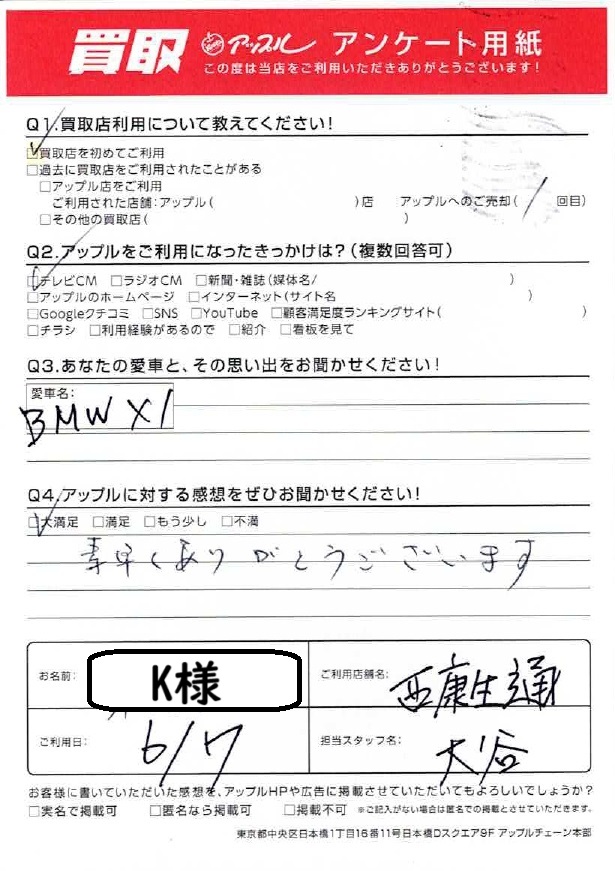 お車のご相談・ 査定だけでもOK! カンタン 入力 30秒 アップルがブランド買取始めました! お電話でも受付中! 受付時間 10:00 ~ 19:00 052-528-5335 お車のご相談・ 査定だけでもOK! カンタン 入力 30秒 アップルがブランド買取始めました! お電話でも受付中! 受付時間 10:00 ~ 19:00 052-528-5335 アップルがブランド買取始めました! お電話でも受付中! 受付時間 10:00 ~ 19:00 052-528-5335 店舗情報 在庫車 スタッフ紹介 ブログ お客様の声 キャンペーン お得 無料査定 click お客様の声 ご記入日: 2024/06/07 K様 車名:BMW X1 ☆大満足☆素早くありがとうございます。 前へ 次へ お客様の声一覧を見る