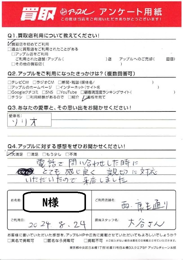 お車のご相談・ 査定だけでもOK! カンタン 入力 30秒 アップルがブランド買取始めました! お電話でも受付中! 受付時間 10:00 ~ 19:00 052-528-5335 お車のご相談・ 査定だけでもOK! カンタン 入力 30秒 アップルがブランド買取始めました! お電話でも受付中! 受付時間 10:00 ~ 19:00 052-528-5335 アップルがブランド買取始めました! お電話でも受付中! 受付時間 10:00 ~ 19:00 052-528-5335 店舗情報 在庫車 スタッフ紹介 ブログ お客様の声 キャンペーン お得 無料査定 click お客様の声 ご記入日: 2024/08/24 N様 車名:スズキ ソリオ ☆大満足☆電話で問い合わせした時にとても感じが良く、親切に対応いただいたので来店しました 前へ 次へ お客様の声一覧を見る