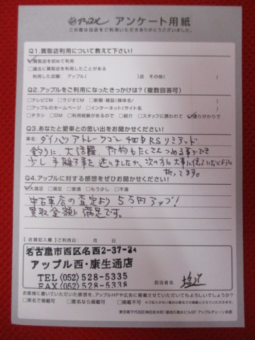 アップルに対する感想:中古車店の査定より5万円アップ!買い取り金額に満足です。
