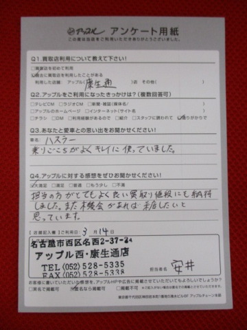アップル西康生通店より:綺麗に乗って頂いた愛車をご売却頂きありがとうございます!次回も是非ご来店下さい!