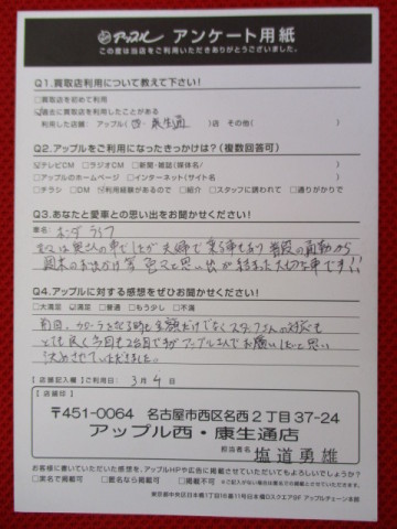 アップル西康生通店より:カローラに続き2台目のご売却も当店を選んで頂き本当に嬉しいです!思い出の沢山詰まった大切な愛車をご売却頂きありがとうございました!