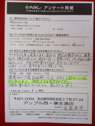 アップルに対する感想:塩道さんに大変お世話になった。やはり人柄がいいのとやる気があって満足ができる契約ができた。次回も車を売ることになったら考えようと思う。