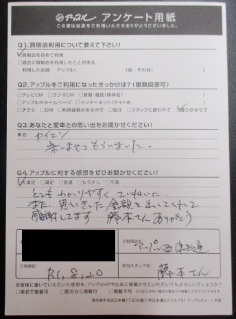 お車のご相談・ 査定だけでもOK! カンタン 入力 30秒 アップルがブランド買取始めました! お電話でも受付中! 受付時間 10:00 ~ 19:00 052-528-5335 お車のご相談・ 査定だけでもOK! カンタン 入力 30秒 アップルがブランド買取始めました! お電話でも受付中! 受付時間 10:00 ~ 19:00 052-528-5335 アップルがブランド買取始めました! お電話でも受付中! 受付時間 10:00 ~ 19:00 052-528-5335 店舗情報 在庫車 スタッフ紹介 ブログ お客様の声 キャンペーン お得 無料査定 click お客様の声 ご記入日: 2019/08/20 匿名様 車名:ポルシェ カイエン 愛車:カイエン思い出:楽しませてもらった。感想:大満足とてもわかりやすくていねいにまた、思いきった金額を出してくれて感謝しています。藤本さんありがとう 前へ 次へ お客様の声一覧を見る