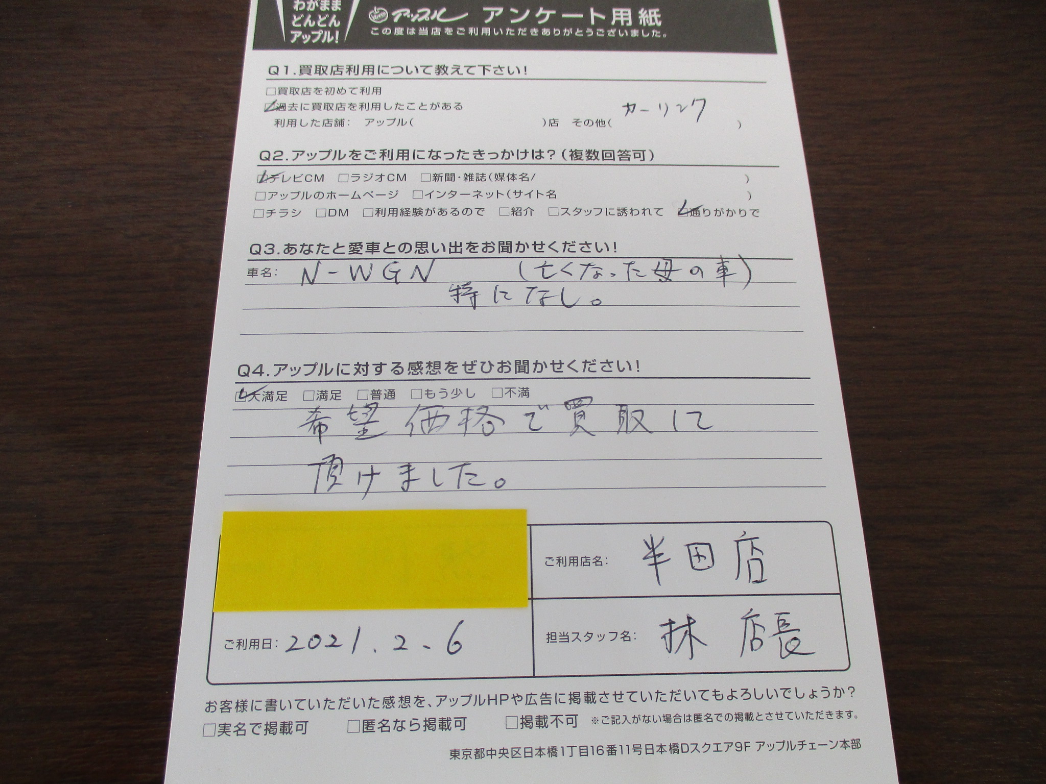 お車のご相談・ 査定だけでもOK! カンタン 入力 30秒 アップルがブランド買取始めました! お電話でも受付中! 受付時間10:00 ~ 19:00 0569-32-3211 お車のご相談・ 査定だけでもOK! カンタン 入力 30秒 アップルがブランド買取始めました! お電話でも受付中! 受付時間10:00 ~ 19:00 0569-32-3211 アップルがブランド買取始めました! お電話でも受付中! 受付時間10:00 ~ 19:00 0569-32-3211 店舗情報 在庫車 スタッフ紹介 ブログ お客様の声 キャンペーン 無料査定 click お客様の声 ご記入日: 2021/02/06 K様 車名:ホンダ N-WGN Qアップルに対する感想をお聞かせください。 希望価格で買い取して頂けました。A 何かと、大変なところ当店をご利用頂きましてありがとうございました。今後ともよろしくお願いいたします。 前へ 次へ お客様の声一覧を見る