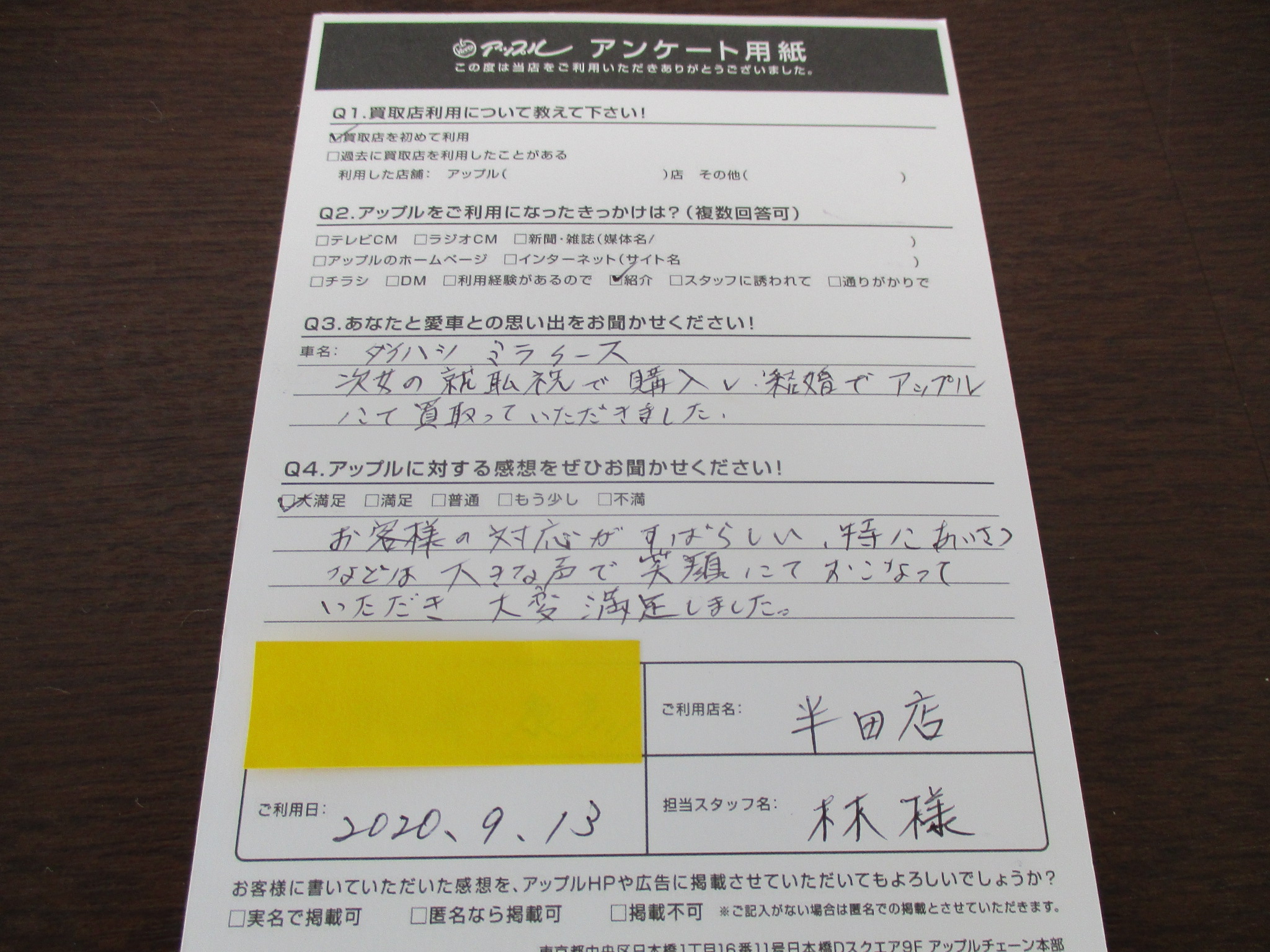 Aお嬢様の思い出のあるお車を売却いただきまして、ありがとうございました。今後ともよろしくお願いいたします。