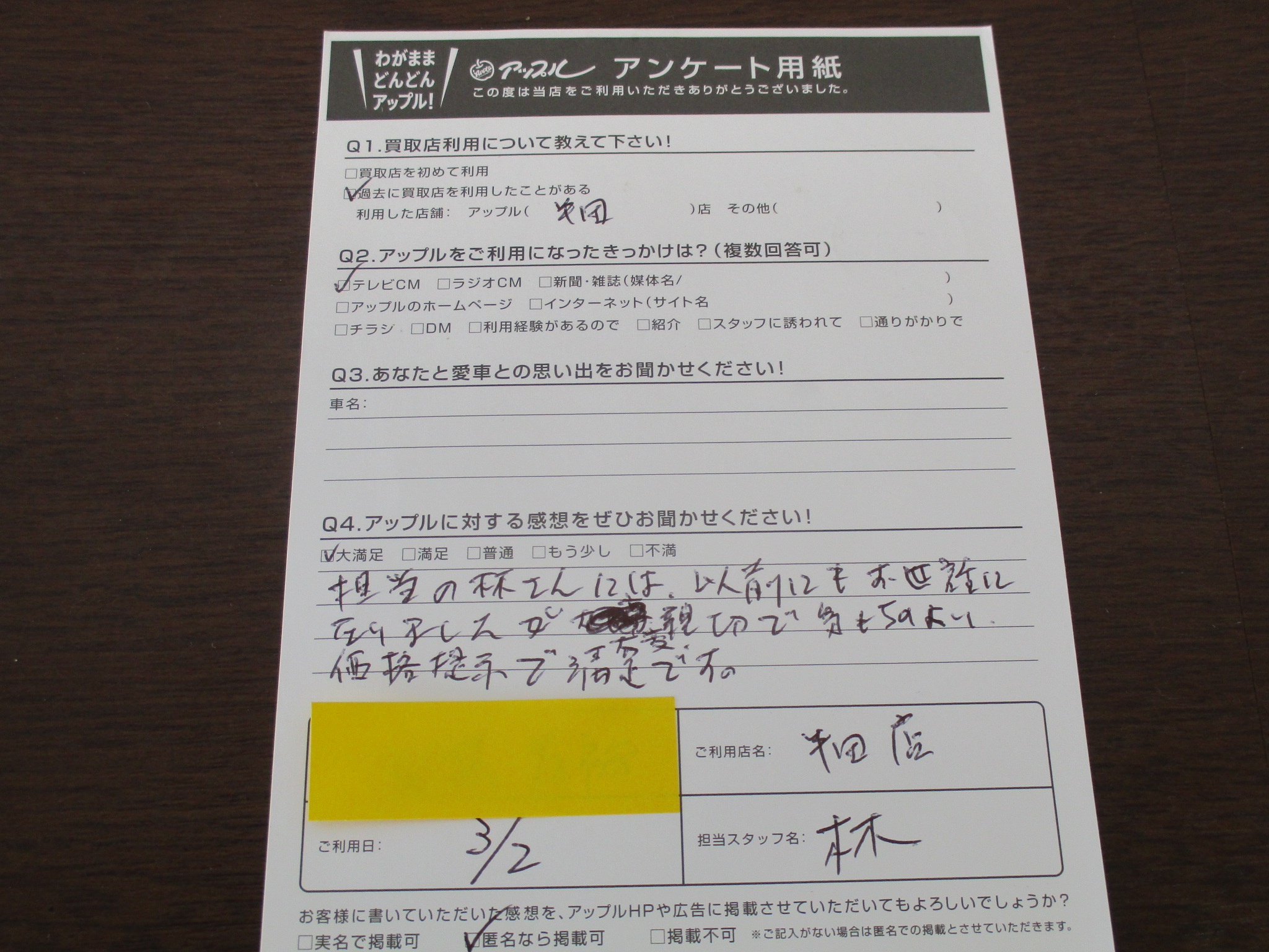 大満足 担当の林さんには、以前にもお世話になりましたが大変親切で気持ちの良い価格提示で満足です。