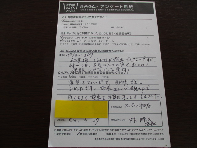 満足・査定もスムーズで即決できて良かったです。店長さんが親切で気持ち良く愛車を手放すことができました。