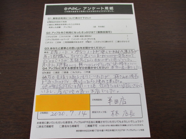 Y様 ありがとうございます。査定させて頂いたその日のうちに嬉しい連絡頂いたのを憶えています。引越しの為売却でしたが、また愛知にお戻り際は宜しくお願いします。