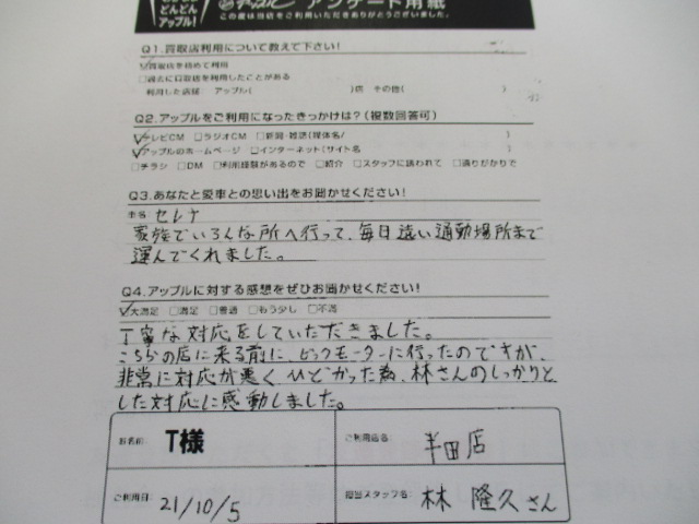 お車を当社に売却して頂き大変感謝しております。ご来店頂いたお客様に感動をしてもらえる様