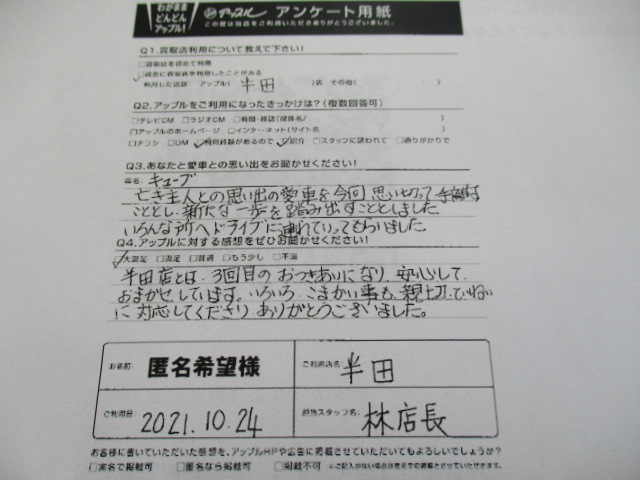 大満足 半田店とは、3回目のお付き合いになり、安心してお任せしています。