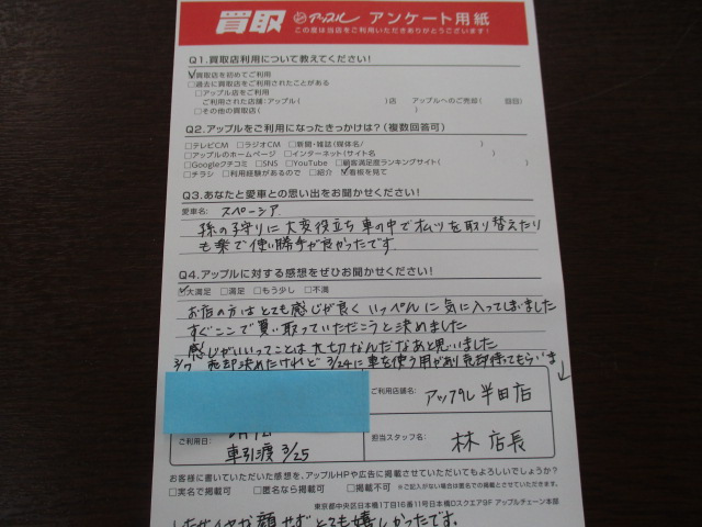 Y様 車名:スズキ スペーシア