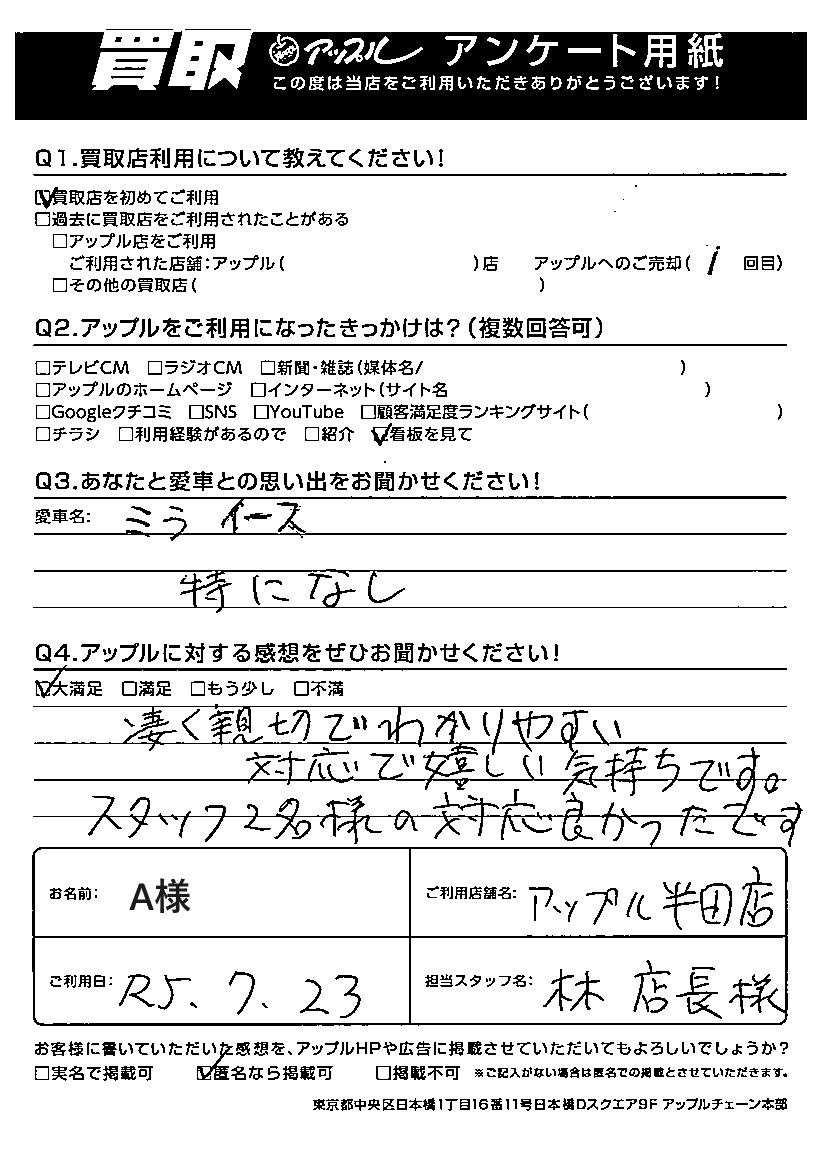 お車のご相談・ 査定だけでもOK! カンタン 入力 30秒 アップルがブランド買取始めました! お電話でも受付中! 受付時間10:00 ~ 19:00 0569-32-3211 お車のご相談・ 査定だけでもOK! カンタン 入力 30秒 アップルがブランド買取始めました! お電話でも受付中! 受付時間10:00 ~ 19:00 0569-32-3211 アップルがブランド買取始めました! お電話でも受付中! 受付時間10:00 ~ 19:00 0569-32-3211 店舗情報 在庫車 スタッフ紹介 ブログ お客様の声 キャンペーン 無料査定 click お客様の声 ご記入日: 2023/07/23 A様 車名:ダイハツ ミライース ご利用日:R5年7月23日 担当:林Q.アップルに対する感想をぜひお聞かせください!大満足凄く親切でわかりやすい対応で嬉しい気持ちです。スタッフ2名様の対応良かったです。 前へ 次へ お客様の声一覧を見る