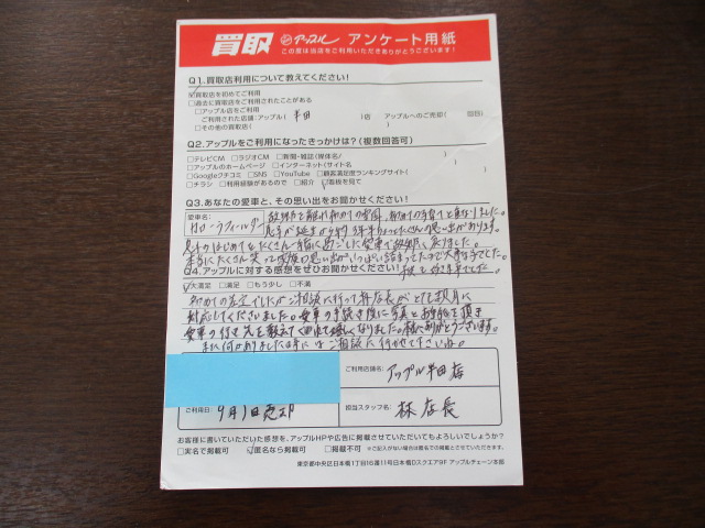 大満足 初めての査定でしたが、相談に行って林店長がとても親身に対応してくださいました。愛車の手続き後に写真とお手紙を頂き愛車の行先を教えてくれて嬉しくなりました。本当にありがとうございます。また、何かありました時には、相談に行かせてくださいね。