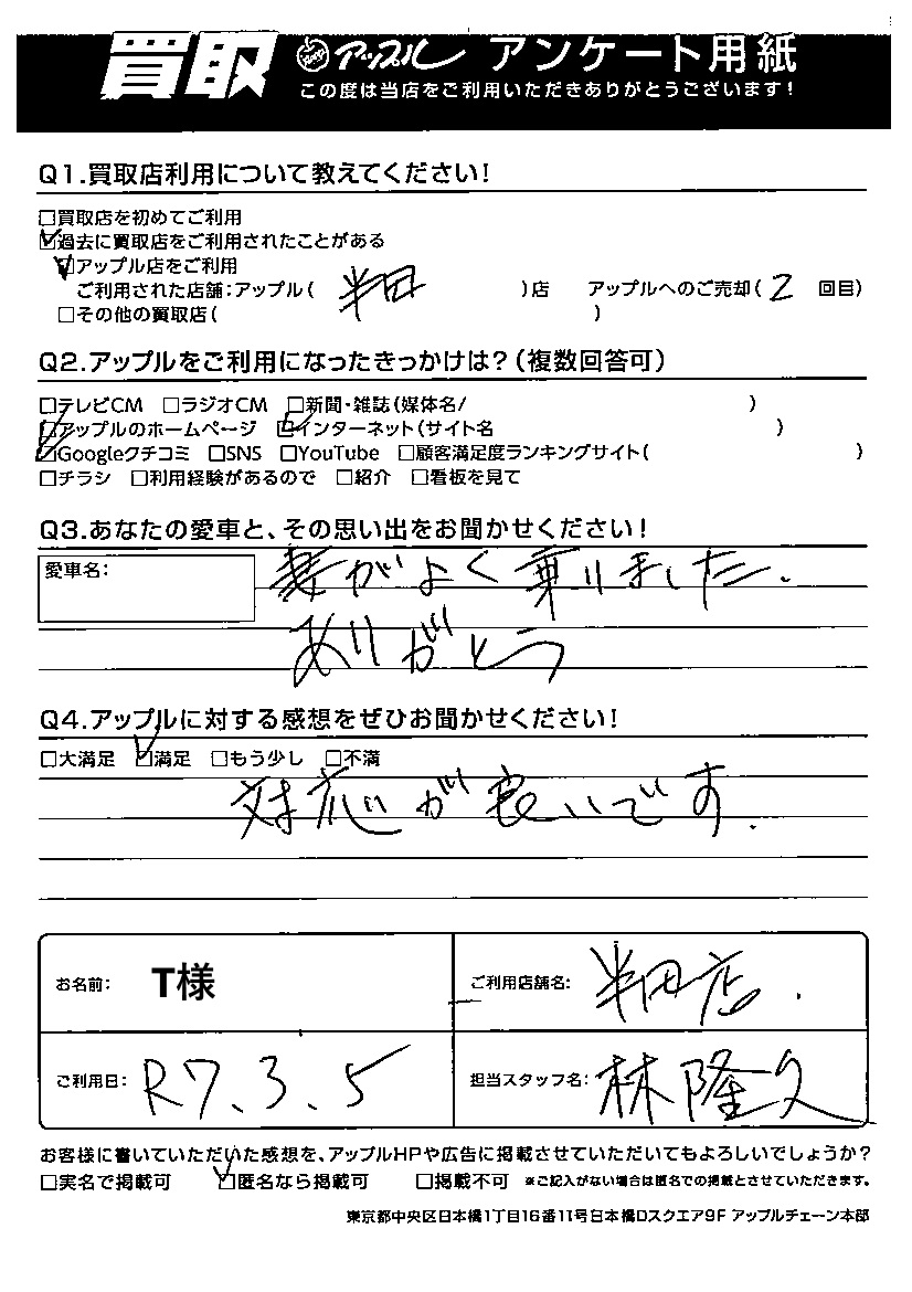 お車のご相談・ 査定だけでもOK! カンタン 入力 30秒 アップルがブランド買取始めました! お電話でも受付中! 受付時間10:00 ~ 19:00 0569-32-3211 お車のご相談・ 査定だけでもOK! カンタン 入力 30秒 アップルがブランド買取始めました! お電話でも受付中! 受付時間10:00 ~ 19:00 0569-32-3211 アップルがブランド買取始めました! お電話でも受付中! 受付時間10:00 ~ 19:00 0569-32-3211 店舗情報 在庫車 スタッフ紹介 ブログ お客様の声 キャンペーン 無料査定 click お客様の声 ご記入日: 2025/03/05 T様 【あなたと愛車との思い出をお聞かせ下さい!】妻がよく乗りました。ありがとう。【アップルに対する感想をぜひお聞かせ下さい!】満足!対応が良いです。担当:林 前へ 次へ お客様の声一覧を見る