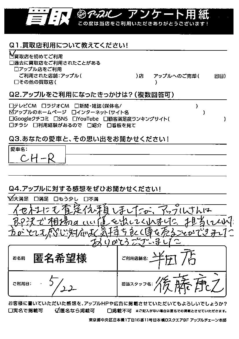 他社にも査定依頼しましたが、アップルさんは即決で相場のいい値を出してくれました。担当してくれた方がとても感じ、対応よく気持ち良く車を売ることができました。ありがとうございました。