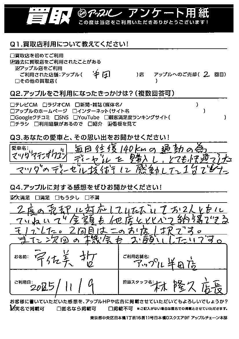 宇佐美 哲様 車名:マツダ アテンザワゴン