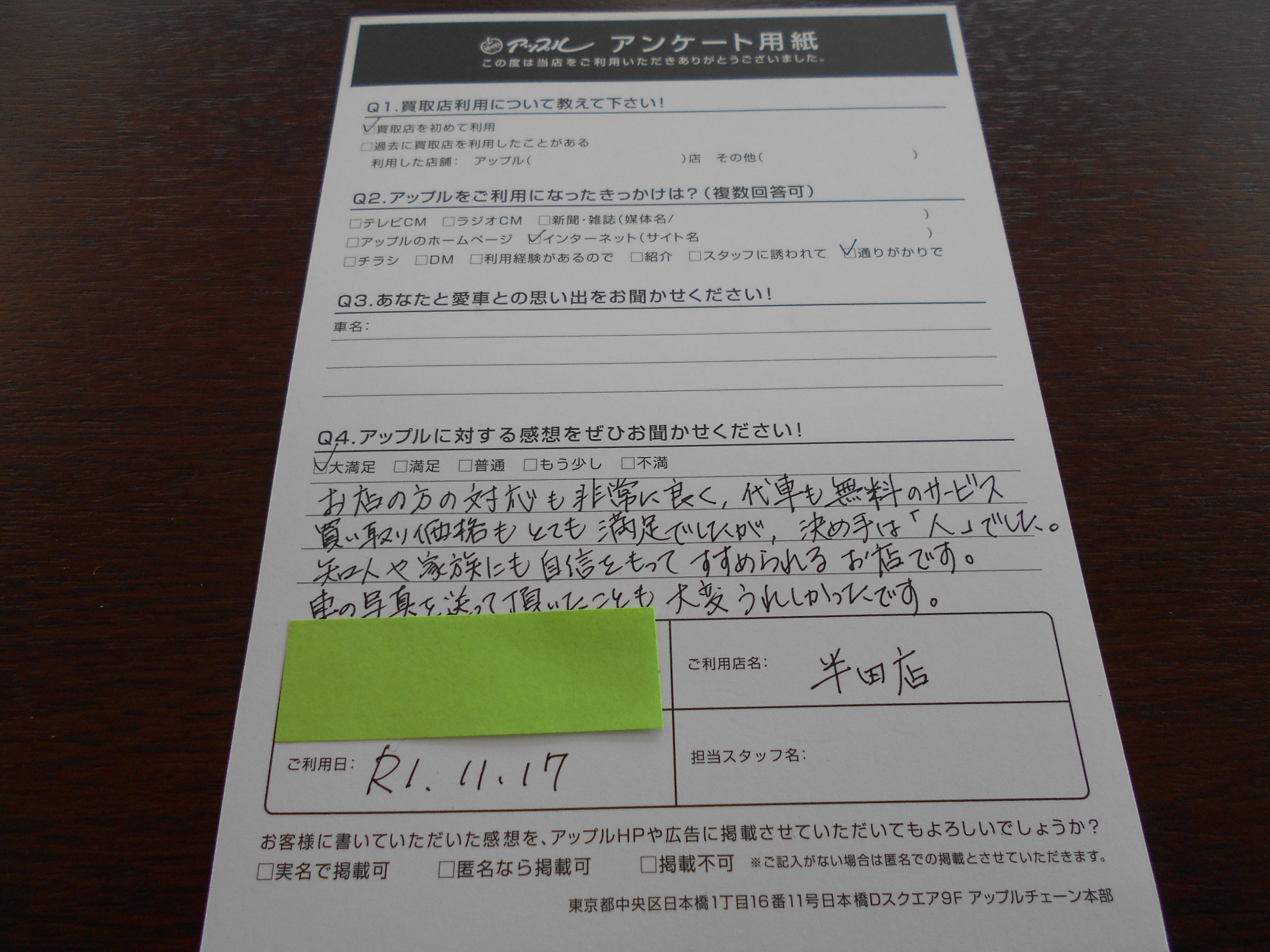 知人や家族にも自信をもって、すすめられるお店です。車の写真を送って頂いたことも、大変うれしかったです。