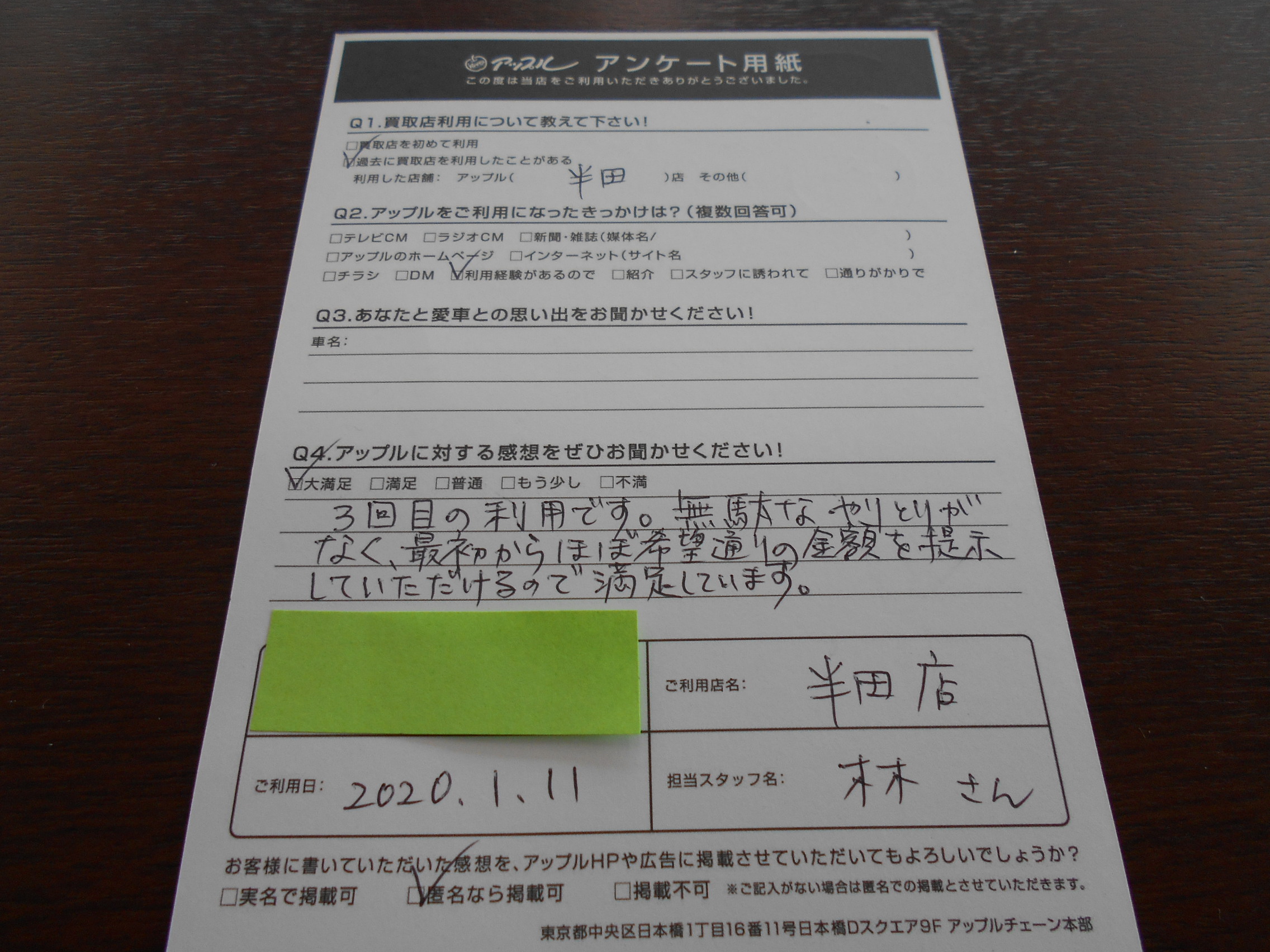 A 大満足 3回目の利用です。無駄なやりとりがなく、最初からほぼ希望通りの金額の提示して頂けるので満足しています。