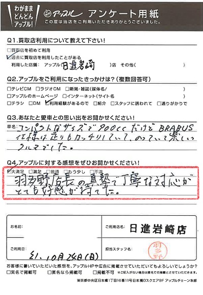 お車のご相談・ 査定だけでもOK! カンタン 入力 30秒 アップルがブランド買取始めました! お電話でも受付中! 受付時間09:30 ~ 18:30 0561-75-6616 お車のご相談・ 査定だけでもOK! カンタン 入力 30秒 アップルがブランド買取始めました! お電話でも受付中! 受付時間09:30 ~ 18:30 0561-75-6616 アップルがブランド買取始めました! お電話でも受付中! 受付時間09:30 ~ 18:30 0561-75-6616 店舗情報 在庫車 スタッフ紹介 ブログ お客様の声 キャンペーン 無料査定 click お客様の声 ご記入日: 2021/10/24 K様 車名:スマート フォーフォー 満足度★★★★★羽多野店長の、真摯で丁寧な対応がとても好感が持てた。 前へ 次へ お客様の声一覧を見る