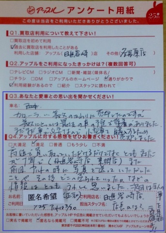 高値で買い取っていただけるだけでなく、とても対応が丁寧で(日進岩崎店 東郷店)また前回アルトの時に写真を送っていただいたことや その後どこへ売られていったのかなどの情報はとてもうれしく思いました。次回は主人の車を是非高値で!