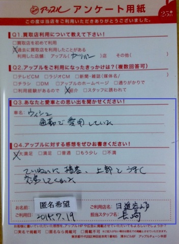 お車のご相談・ 査定だけでもOK! カンタン 入力 30秒 アップルがブランド買取始めました! お電話でも受付中! 受付時間09:30 ~ 18:30 0561-75-6616 お車のご相談・ 査定だけでもOK! カンタン 入力 30秒 アップルがブランド買取始めました! お電話でも受付中! 受付時間09:30 ~ 18:30 0561-75-6616 アップルがブランド買取始めました! お電話でも受付中! 受付時間09:30 ~ 18:30 0561-75-6616 店舗情報 在庫車 スタッフ紹介 ブログ お客様の声 キャンペーン 無料査定 click お客様の声 ご記入日: 2014/07/19 F・T様 ■ご利用日時■ H26年7月19日■車 種■ウィッシュ■担当者■ 長崎【アップルに対する感想をぜひお書きください】満足度★★★★★丁寧に接客 上部とうまく交渉してくれた 前へ 次へ お客様の声一覧を見る