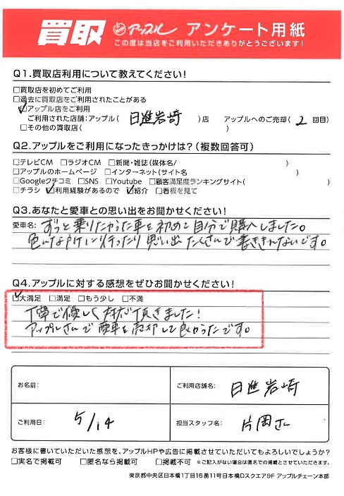 お車のご相談・ 査定だけでもOK! カンタン 入力 30秒 アップルがブランド買取始めました! お電話でも受付中! 受付時間09:30 ~ 18:30 0561-75-6616 お車のご相談・ 査定だけでもOK! カンタン 入力 30秒 アップルがブランド買取始めました! お電話でも受付中! 受付時間09:30 ~ 18:30 0561-75-6616 アップルがブランド買取始めました! お電話でも受付中! 受付時間09:30 ~ 18:30 0561-75-6616 店舗情報 在庫車 スタッフ紹介 ブログ お客様の声 キャンペーン 無料査定 click お客様の声 ご記入日: 2022/05/14 M様 車名:日産 デイズ 満足度★★★★★丁寧で優しく対応頂きました!アップルさんで愛車を売却して良かったです。 前へ 次へ お客様の声一覧を見る