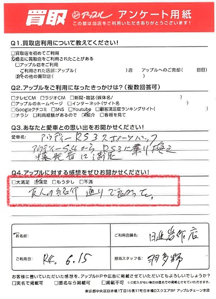 お車のご相談・ 査定だけでもOK! カンタン 入力 30秒 アップルがブランド買取始めました! お電話でも受付中! 受付時間09:30 ~ 18:30 0561-75-6616 お車のご相談・ 査定だけでもOK! カンタン 入力 30秒 アップルがブランド買取始めました! お電話でも受付中! 受付時間09:30 ~ 18:30 0561-75-6616 アップルがブランド買取始めました! お電話でも受付中! 受付時間09:30 ~ 18:30 0561-75-6616 店舗情報 在庫車 スタッフ紹介 ブログ お客様の声 キャンペーン 無料査定 click お客様の声 ご記入日: 2022/06/15 N様 車名:アウディ RS3スポーツバック 満足度★★★★友人の紹介通りで良かった。 前へ 次へ お客様の声一覧を見る