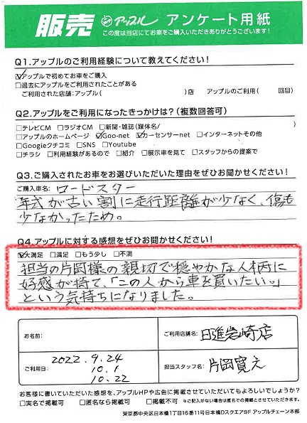 お車のご相談・ 査定だけでもOK! カンタン 入力 30秒 アップルがブランド買取始めました! お電話でも受付中! 受付時間09:30 ~ 18:30 0561-75-6616 お車のご相談・ 査定だけでもOK! カンタン 入力 30秒 アップルがブランド買取始めました! お電話でも受付中! 受付時間09:30 ~ 18:30 0561-75-6616 アップルがブランド買取始めました! お電話でも受付中! 受付時間09:30 ~ 18:30 0561-75-6616 店舗情報 在庫車 スタッフ紹介 ブログ お客様の声 キャンペーン 無料査定 click お客様の声 ご記入日: 2022/10/22 A様 車名:マツダ ロードスター 満足度★★★★★担当の片岡様の親切で穏やかな人柄に好感が持て、『この人から車を買いたい。』という気持ちになりました。 前へ 次へ お客様の声一覧を見る