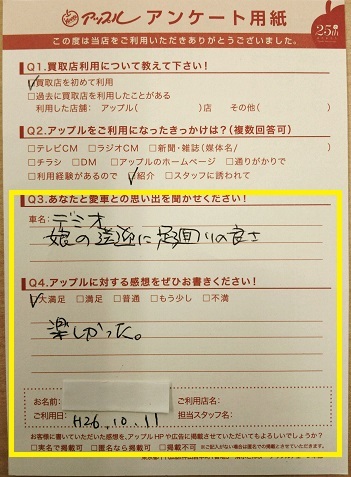 お車のご相談・ 査定だけでもOK! カンタン 入力 30秒 アップルがブランド買取始めました! お電話でも受付中! 受付時間09:30 ~ 18:30 0561-75-6616 お車のご相談・ 査定だけでもOK! カンタン 入力 30秒 アップルがブランド買取始めました! お電話でも受付中! 受付時間09:30 ~ 18:30 0561-75-6616 アップルがブランド買取始めました! お電話でも受付中! 受付時間09:30 ~ 18:30 0561-75-6616 店舗情報 在庫車 スタッフ紹介 ブログ お客様の声 キャンペーン お得 無料査定 click お客様の声 ご記入日: 2014/10/11 I・M様 ■ご利用日時■ H26年10月11日■車種■ デミオ■担当者■ 【アップルに対する感想をぜひお書きください】満足度★★★★★楽しかった。 前へ 次へ お客様の声一覧を見る