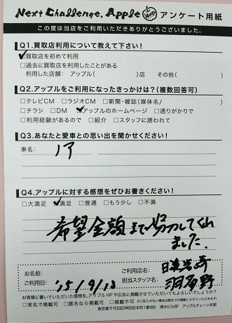 お車のご相談・ 査定だけでもOK! カンタン 入力 30秒 アップルがブランド買取始めました! お電話でも受付中! 受付時間09:30 ~ 18:30 0561-75-6616 お車のご相談・ 査定だけでもOK! カンタン 入力 30秒 アップルがブランド買取始めました! お電話でも受付中! 受付時間09:30 ~ 18:30 0561-75-6616 アップルがブランド買取始めました! お電話でも受付中! 受付時間09:30 ~ 18:30 0561-75-6616 店舗情報 在庫車 スタッフ紹介 ブログ お客様の声 キャンペーン 無料査定 click お客様の声 ご記入日: 2015/09/13 匿名希望様 ■ご利用日時■ H27年9月13日■車種■ ノア■担当者■ 羽多野【アップルに対する感想をぜひお書きください】満足度★★★★希望金額まで努力してくれました。 前へ 次へ お客様の声一覧を見る
