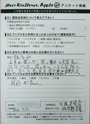 お車のご相談・ 査定だけでもOK! カンタン 入力 30秒 アップルがブランド買取始めました! お電話でも受付中! 受付時間09:30 ~ 18:30 0561-75-6616 お車のご相談・ 査定だけでもOK! カンタン 入力 30秒 アップルがブランド買取始めました! お電話でも受付中! 受付時間09:30 ~ 18:30 0561-75-6616 アップルがブランド買取始めました! お電話でも受付中! 受付時間09:30 ~ 18:30 0561-75-6616 店舗情報 在庫車 スタッフ紹介 ブログ お客様の声 キャンペーン 無料査定 click お客様の声 ご記入日: 2015/09/12 U・Y様 ■ご利用日時■ H27 年9月12日■車種■ アルファード■担当者■ 羽多野【アップルに対する感想をぜひお書きください】満足度★★★★★対応が良い。 前へ 次へ お客様の声一覧を見る