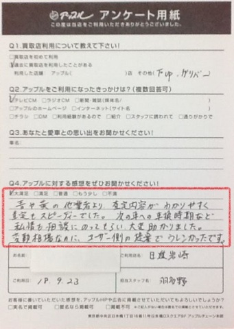青や黄の他業者より、査定内容がわかりやすく査定もスピーディーでした。次の車への車換時期など私情も相談に乗ってもらい大変助かりました。