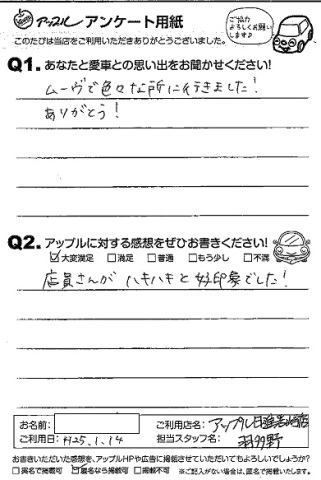 お車のご相談・ 査定だけでもOK! カンタン 入力 30秒 アップルがブランド買取始めました! お電話でも受付中! 受付時間09:30 ~ 18:30 0561-75-6616 お車のご相談・ 査定だけでもOK! カンタン 入力 30秒 アップルがブランド買取始めました! お電話でも受付中! 受付時間09:30 ~ 18:30 0561-75-6616 アップルがブランド買取始めました! お電話でも受付中! 受付時間09:30 ~ 18:30 0561-75-6616 店舗情報 在庫車 スタッフ紹介 ブログ お客様の声 キャンペーン 無料査定 click お客様の声 ご記入日: 2013/01/14 匿名希望様 【愛車との思い出】ムーヴで色々な所へ行きました!ありがとう!【アップルに対する感想】店員さんがハキハキと好印象でした! 前へ 次へ お客様の声一覧を見る